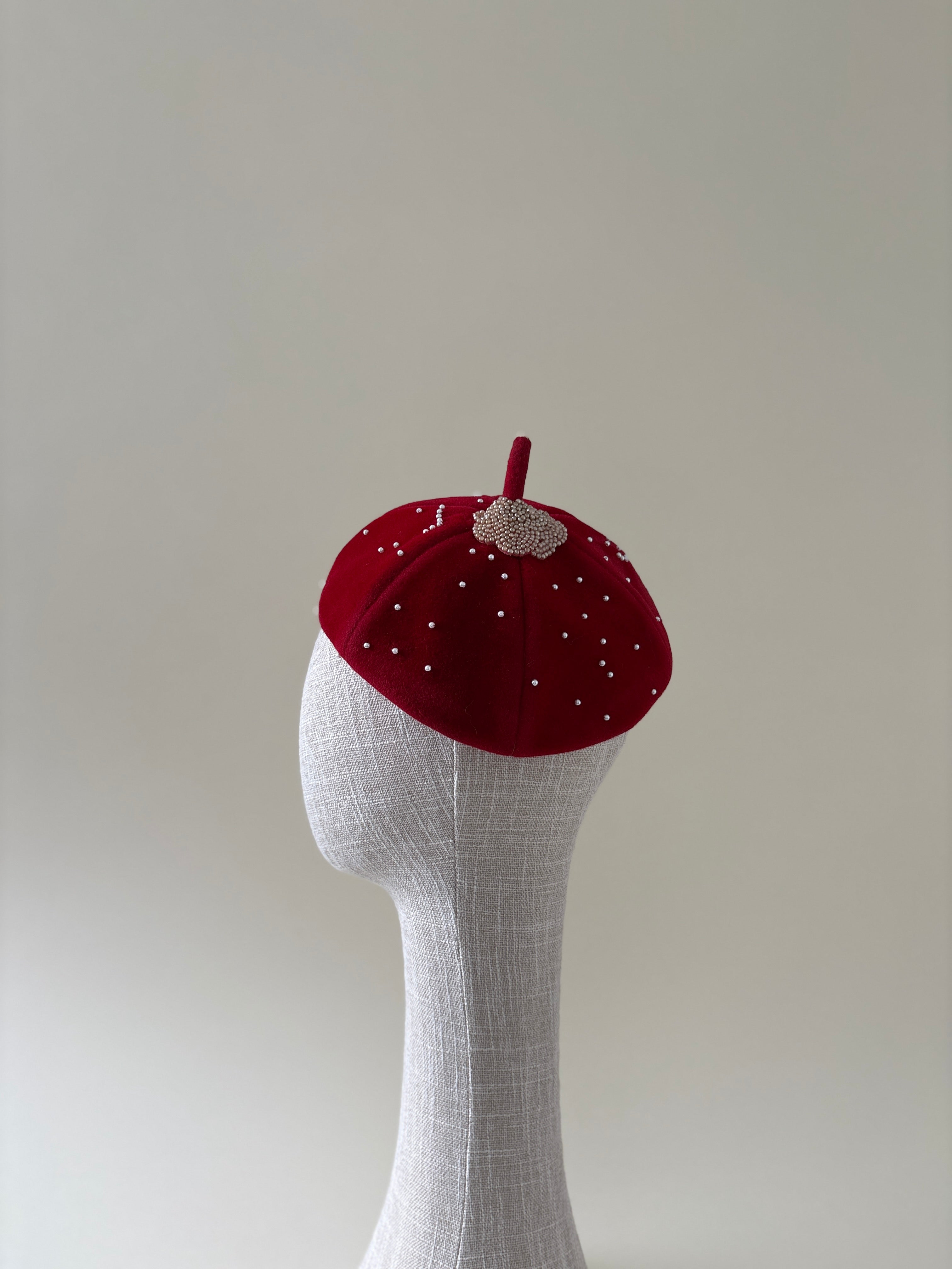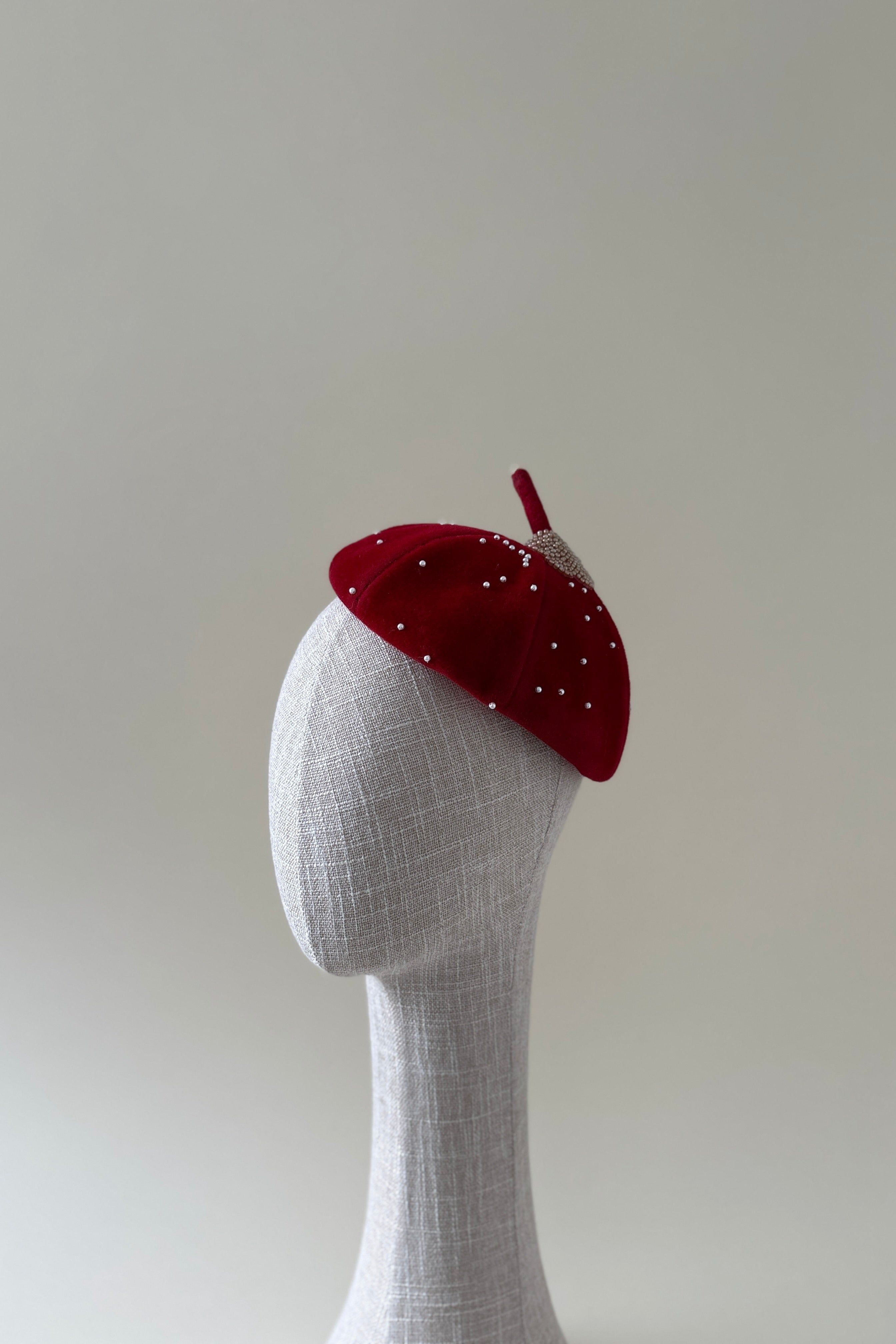Vintage hat #049 | 1940's Red fur felt beret cocktail hat with pearl details