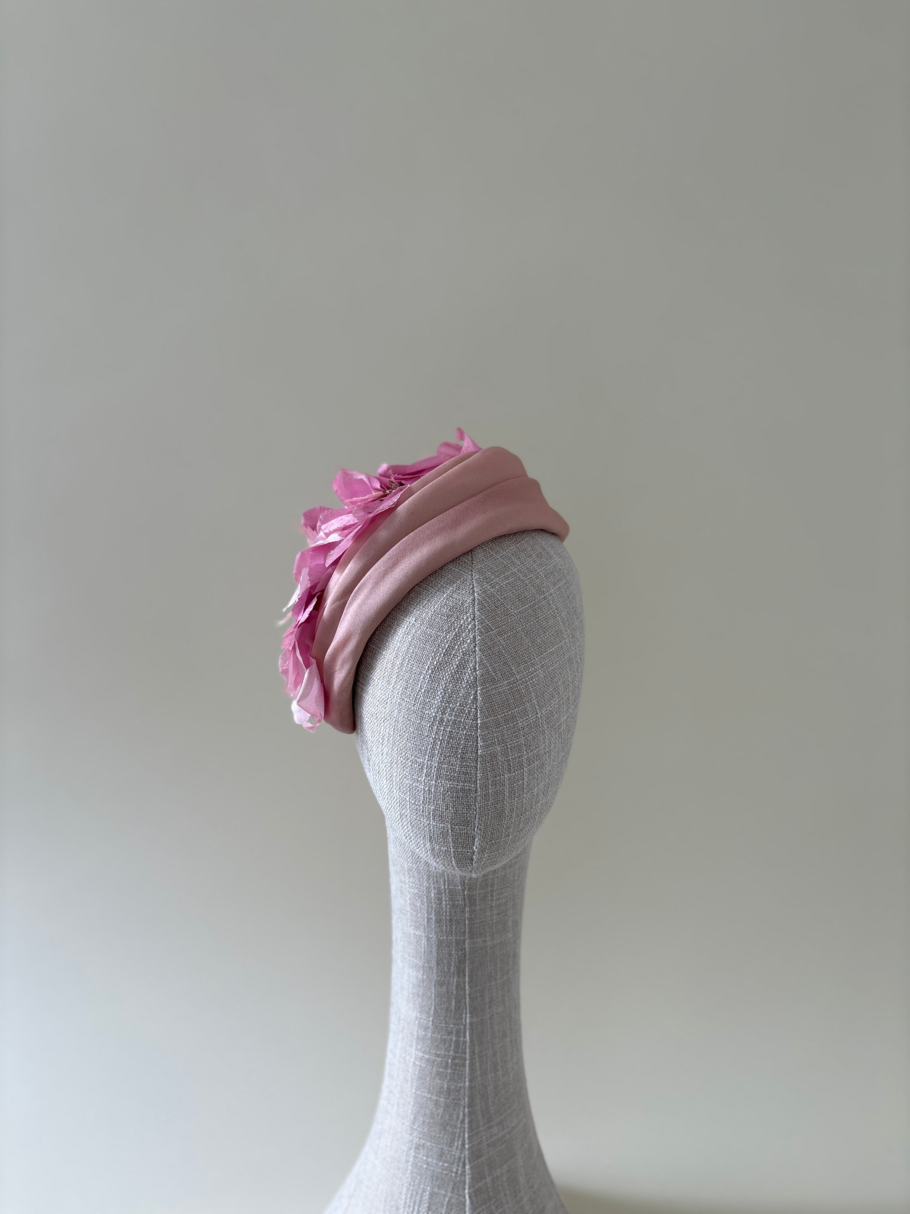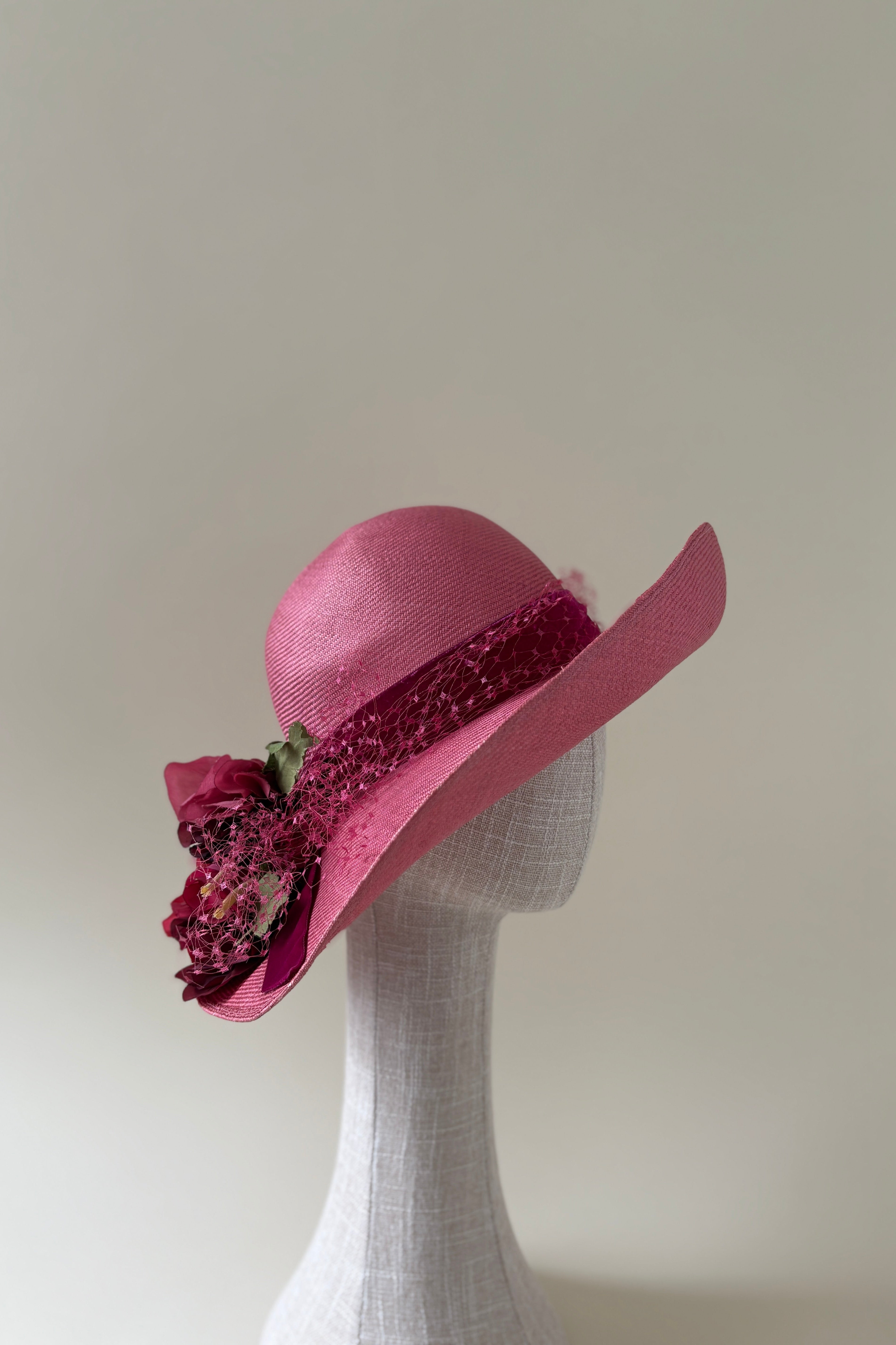 Vintage hat #008 | 1950's pink teardrop cocktail hat with flowers