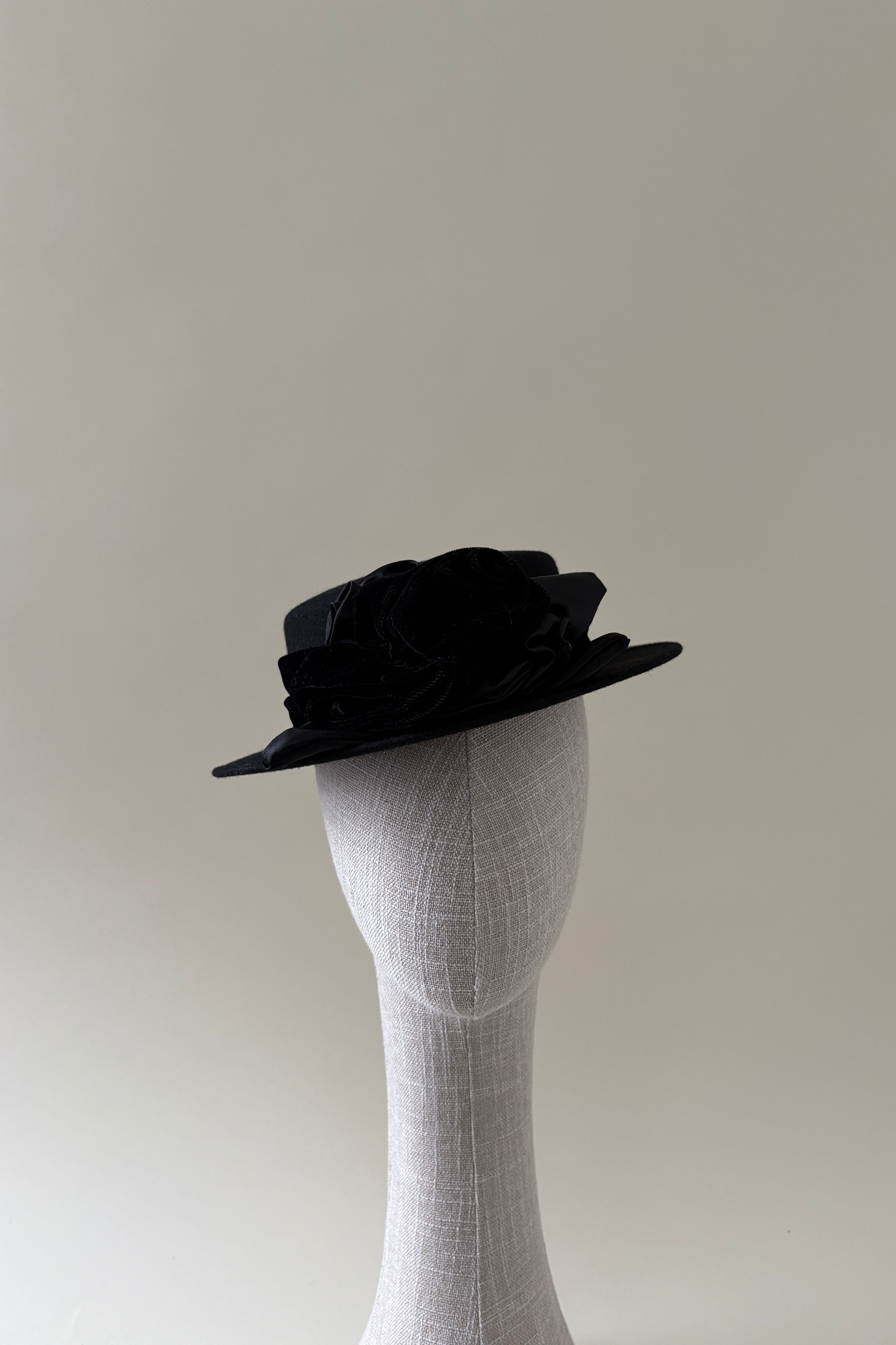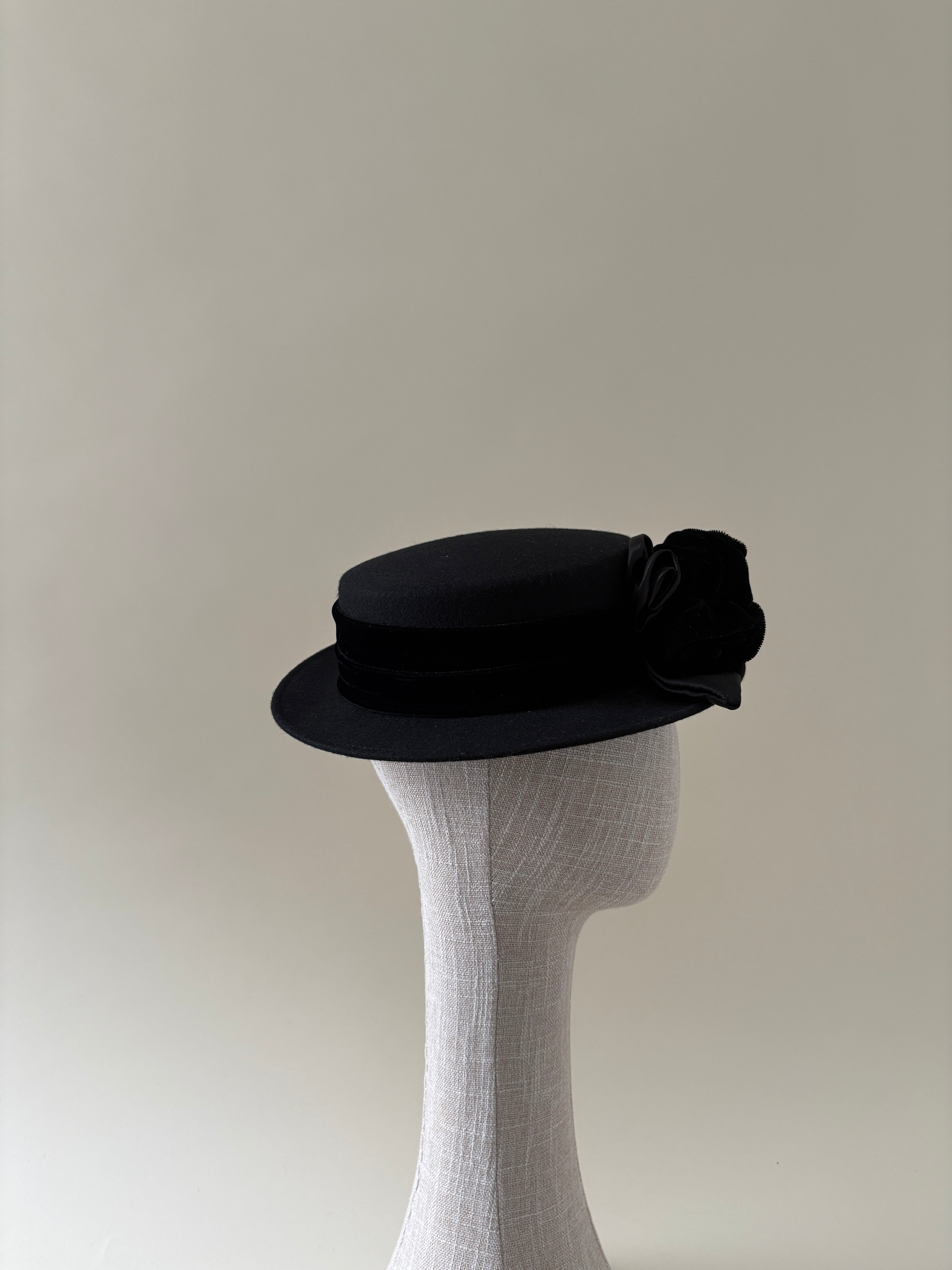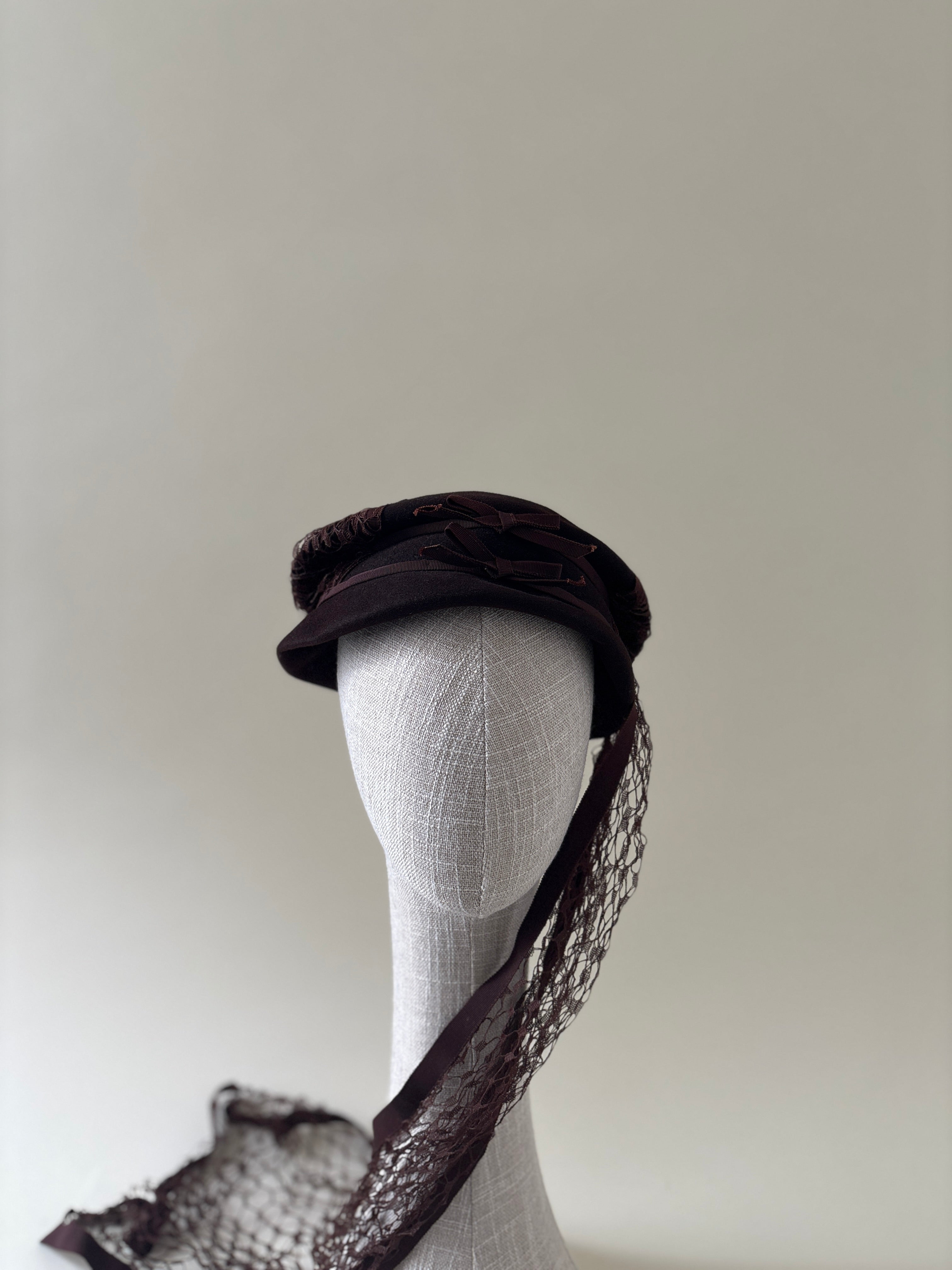 Hats are delicate objects and are easily crushed or misshapen when improperly stored or donated. Each vintage hat in this collection has been carefully evaluated and given the care it needed to be worn again. Some have been reshaped, others gently cleaned, and a few refreshed with new ribbons, flowers, or veils, often using vintage materials from my own archive. Every intervention was made with restraint, preserving the original character and craftsmanship of the piece.